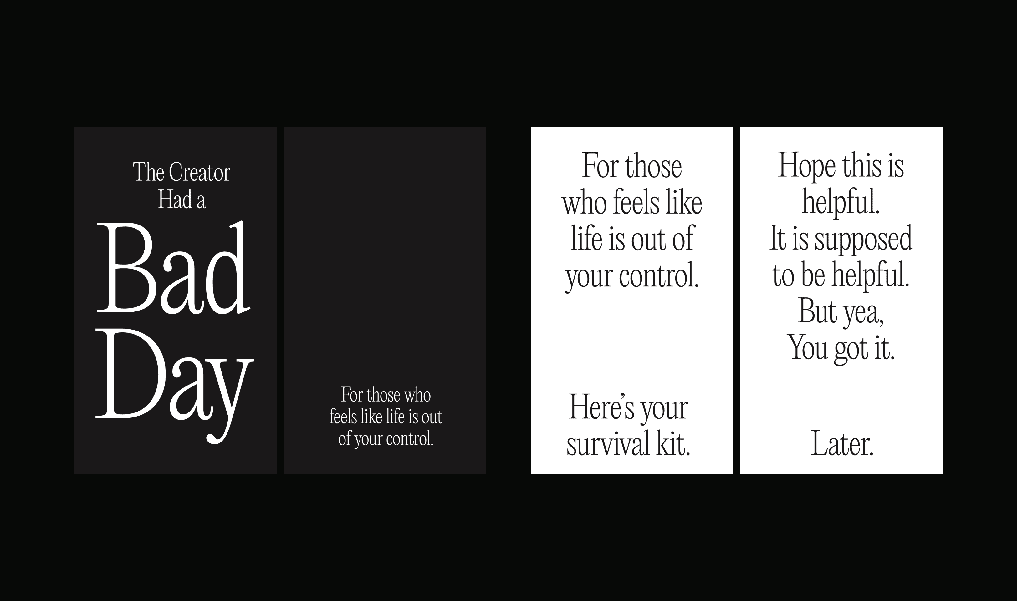 The creator had a bad day? who even is the creator? Is it God, whoever the creator is is symbolized as the "external force" here that gives you a bad day :( The idea of this book blends sarcasm with structure, using diagrams to give unserious but straight-forward facts. Each page features calendar-style numbers, a "bad day" quote, and humorous content that mixes memes and pop culture references. Think of it as a parody, relatable book that feels oddly comforting.